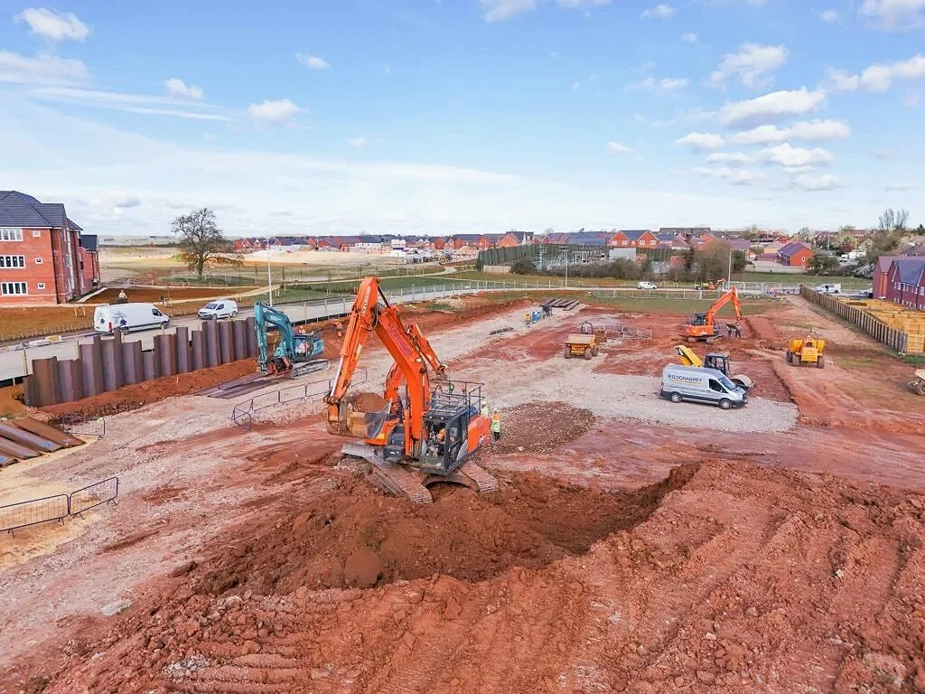 Progress is well underway at Shottery, with our main works focusing around preparing the site and the footprint of the school. In order to achive this, we are currently undertaking a significant cut-and-fill exercise to level the ground in preparation for the formation of the foundations. Alongside the cut and fill, we have also begun the construction of the stone subbase to the school netball courts.